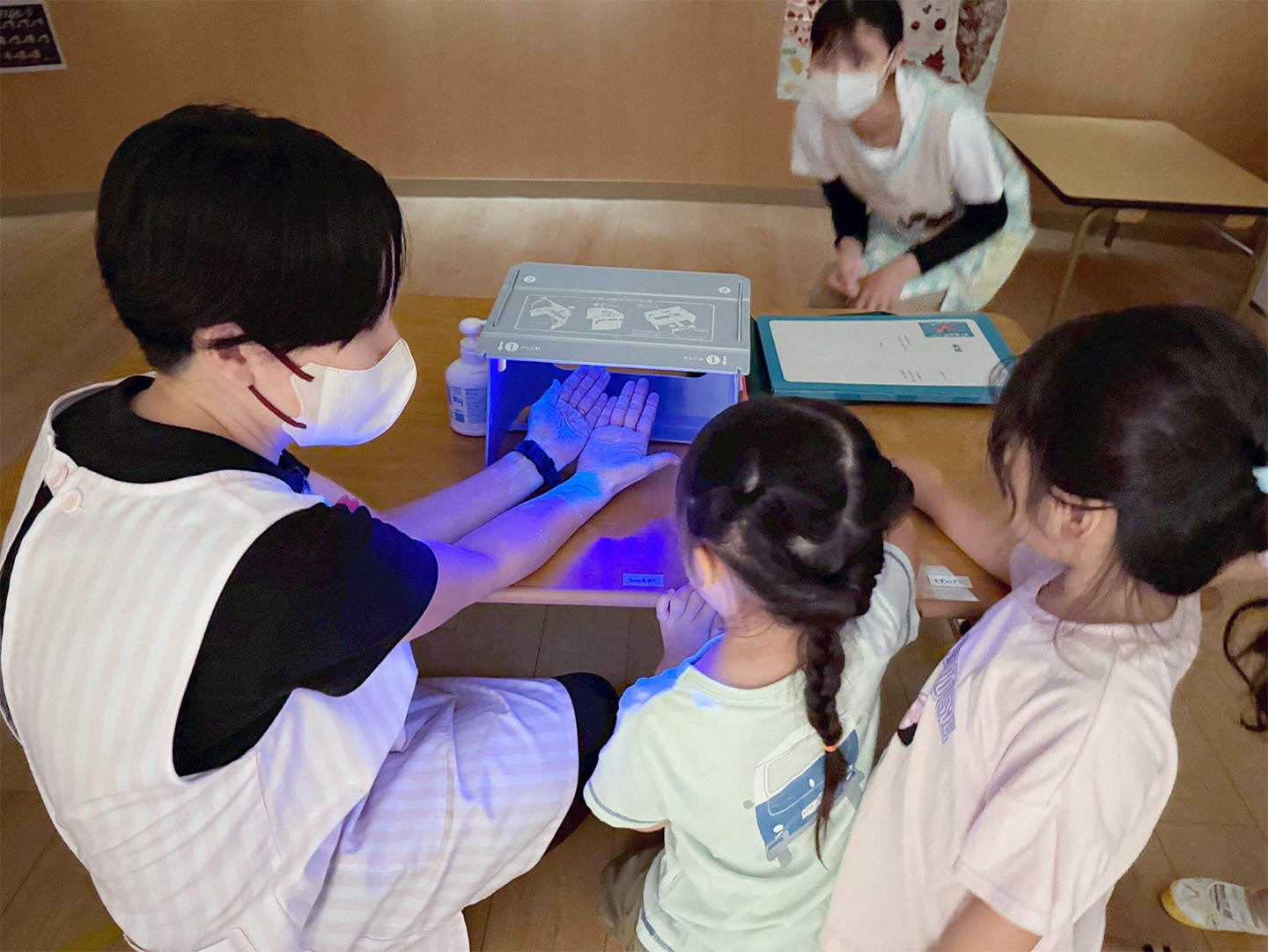 上手に手洗いできたかな? 2025年8月26日 2025年8月26日 4・5歳児クラスのお友だちが看護師の先生と一緒に手洗いの練習をしました!手洗いが上手にできているか、専用のローションをつけて手洗いチェッカーを使ってチェック☆手を洗った後ブラックライトに当ててみると、「きれいになった!」「ばい菌がいなくなった!」と言って上手に洗えていることを実感♪ これからも、きれいに手洗いをして健康に過ごしていきたいです! みんなで手洗いのポーズを確認しました。 ① おねがいのポーズ② かめのポーズ③ おやまのポーズ④ おおかみのポーズ⑤ バイクのポーズ⑥ つかまえたのポーズ