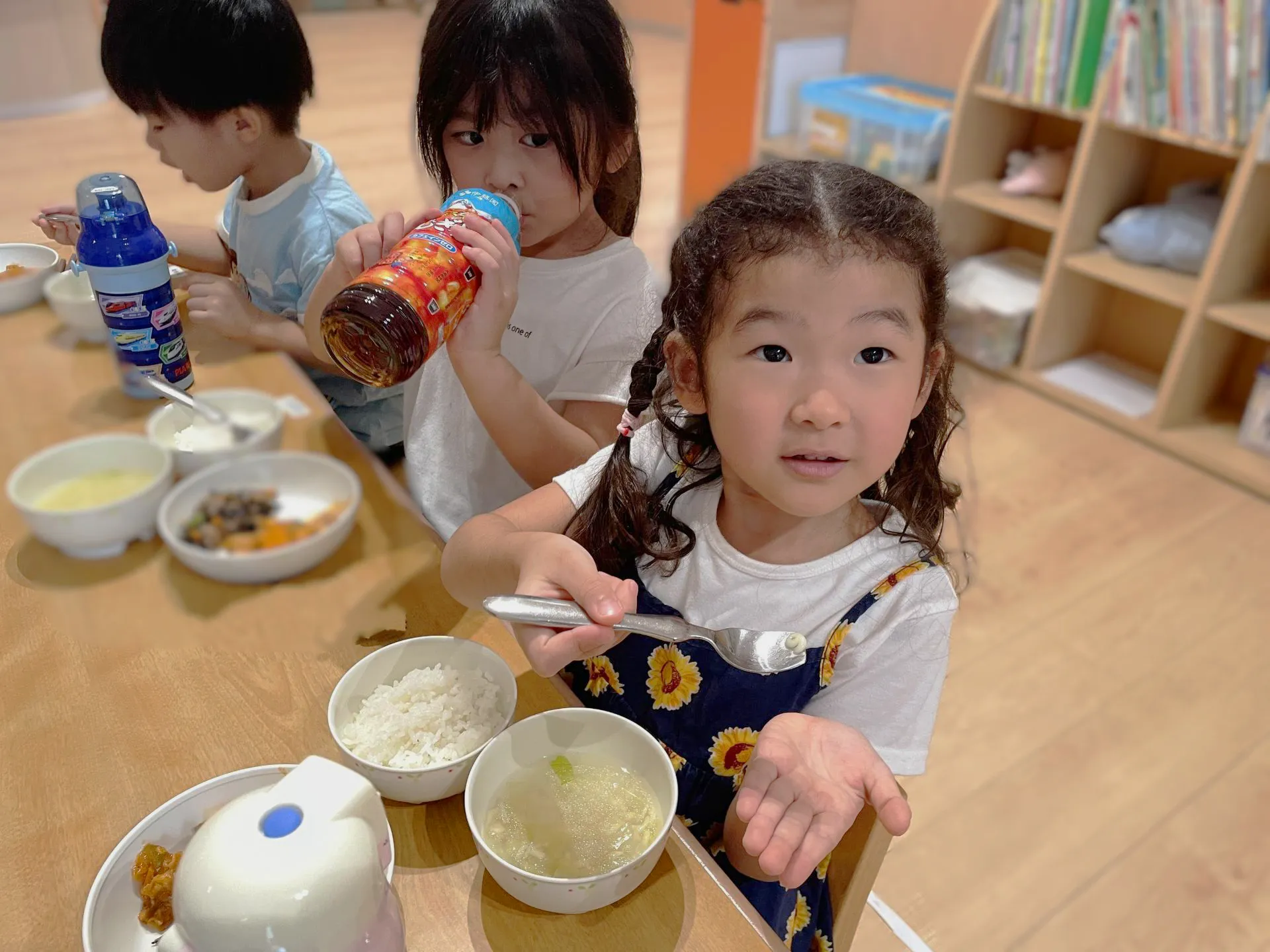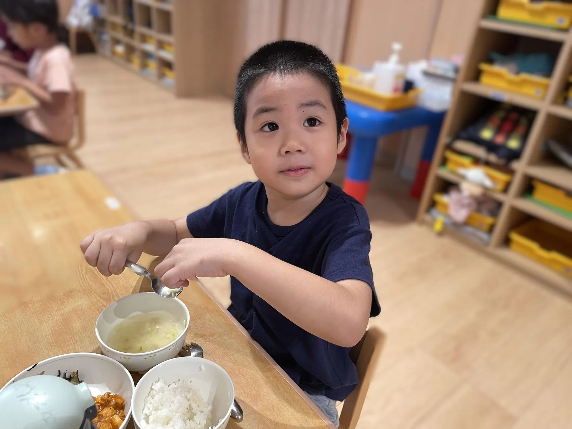 スープの中をのぞくと「ABCだ!」「ECCでやったやつ」と大盛り上がりのきりん組さん。