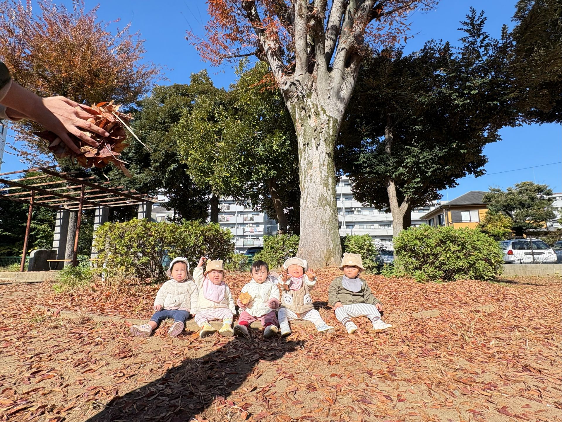 地面いっぱいに広がる枯れ葉🍁の絨毯を踏んでカサカサ♪と音を楽しんだり、葉っぱをビリビリ破いたり、